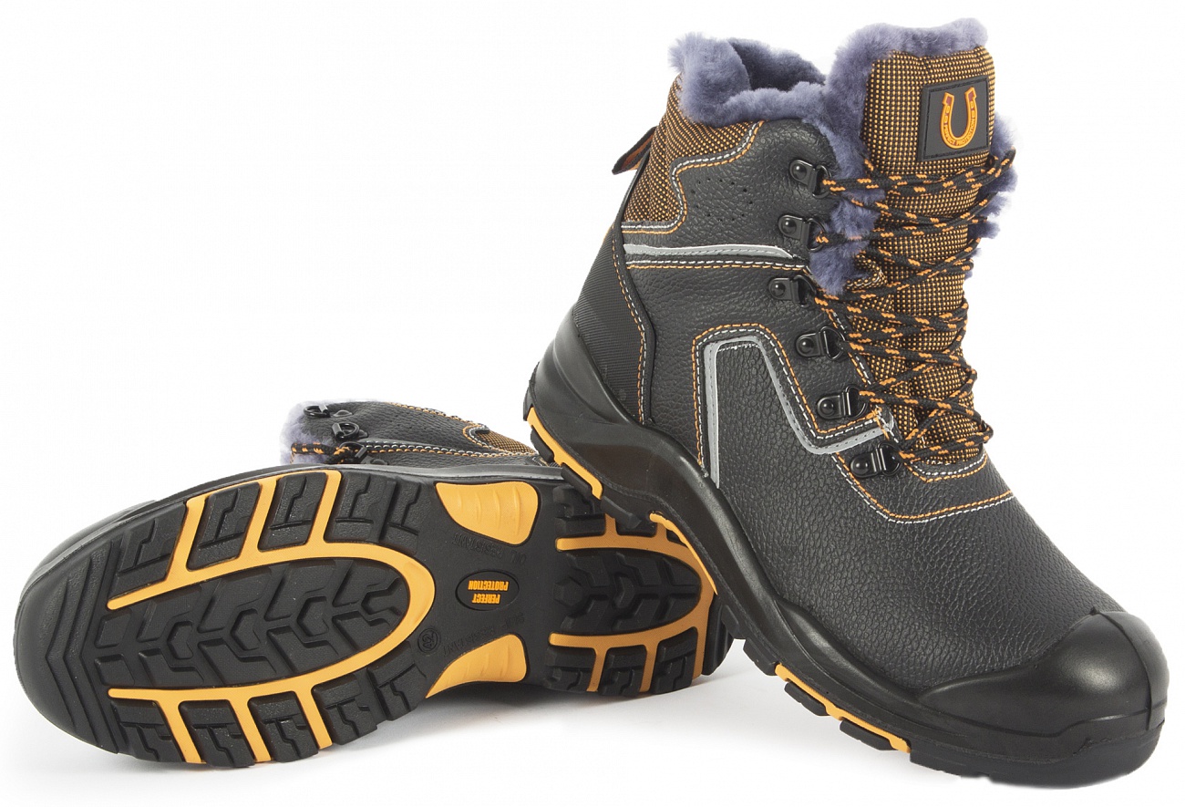 БОТИНКИ: - верх обуви: союзка и задник - кожа - подкладка: натуральный мех (овчина) - подносок: укрепленный, поликарбонатный Мун 200 Дж - стелька: металлическая - подошва: двуслойная, полиуретан и нитрильная резина - летод крепления: литьевой