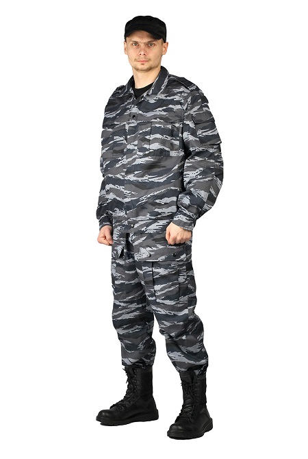 Куртка на поясе с регулировкой, застёжка на молнию и кнопки, погоны на липучке, два объёмных накладных кармана на молнии, усилительные накладки на рукавах и объёмные карманы с клапаном на липучку, вентиляционная вставка из сетки под проймой, низ рукавов на манжете с регулировкой. Брюки под широкий ремень, гульфик на молнию и кнопки, верхние боковые карманы, накладные объёмные карманы с клапаном на кнопки, усилительные накладки в области колен, на задней половинке фигурный накладной карман с фигурным клапаном, под клапаном патронташ, низ брюк под резинку, имеется пуфта со штрипкой.