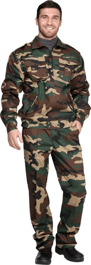 Костюм мужской, состоит из куртки и брюк. Куртка прямого силуэта с центральной застежкой на молнию, верхними накладными карманами с клапанами на кнопках и нижними карманами с «листочкой» на молнии, отложным воротником. Пояс куртки стянут эластичной тесьмой. На плечевых швах погоны на кнопке. Брюки с прорезными боковыми карманами. На передних половинках брюк застрочены стрелки. ГОСТ 27575-87 Ткань верха: «Грета», 53%-х/б, 47%-п/э; пл. 230 г/мІ Цвет: зеленый КМФ Размер: с 44-46 по 60-62 Рост: 170-176, 182-188