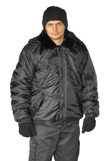 Куртка укороченная, с застежкой на молнию, меховым воротником, съемным капюшоном, поясом и манжетами на эластичной ленте. На куртке карманы на молнии, на левом рукаве карман в шве, погоны на кнопках.