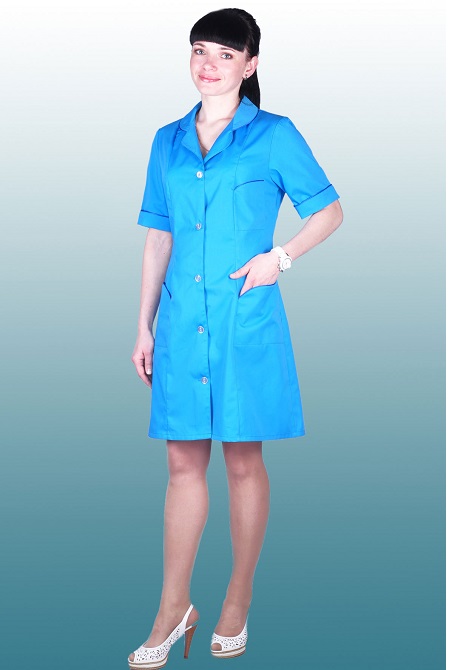 Классическая модель с застежкой на пуговицы. Отложной воротник с закругленными концами, рукава короткие, накладные карманы с фигурным входом и манжеты подчеркнуты васильковым кантом. Халат по талии регулируется хлястиком |