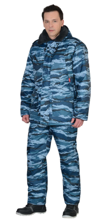 Костюм мужской утеплённый: куртка длинная, полукомбинезон. Куртка на молнии с ветрозащитным клапаном, съёмным капюшоном, накладными и прорезными карманами. Притачной меховой воротник, кулиска по линии талии, трикотажные манжеты внутри рукавов обеспечивают дополнительную теплозащиту. Полукомбинезон с центральной застёжкой-"молнией" и двумя боковыми накладными карманами.Тк. "Оксфорд", 100% п/э. Утеплитель: синтепон, в куртке 450 г/кв.м., в полукомбинезоне 300 г/кв.м. Подкладка: 100% п/э. ГОСТ 12.4.303-2016