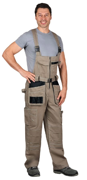 Полукомбинезон с центральной застежкой-молнией, с накладными и отлетными боковыми карманами и с нижними карманами, переходящими на задние половинки. Объемные за счет защипов наколенники-карманы, застегиваются на липучки. ГОСТ 12.4.280-2014.