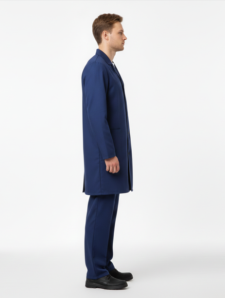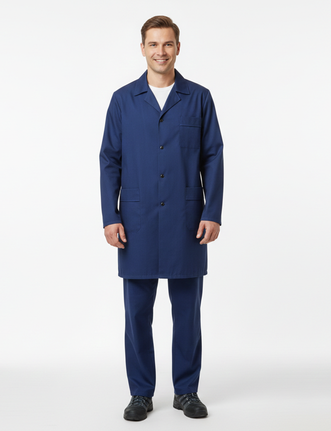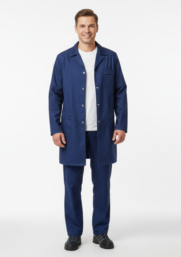 Халат с отложным воротником, длинными рукавами, 3-мя накладными карманами Цвет :т.синий, черный Материал: ткань бязь140 г/м2 .Состав: 100% хлопок ГОСТ 12.4.132-83