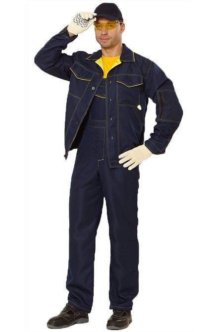 Рекомендуется для рабочего и инженерно - технического персонала. Куртка с притачным поясом на эластичной тесьме и потайной застежкой на пуговицы. На полочках на уровне шва притачивания кокеток расположены накладные карманы с клапанами,в нижней части - большие накладные карманы. Нижний воротник и нижний клапан выполнен из отделочной ткани, образующей отделочный кант. Полукомбинезон с отрезной грудкой на бретелях с эластичной тесьмой и застёжкой на пряжку-фастекс с боковыми и задними карманами для инструментов.