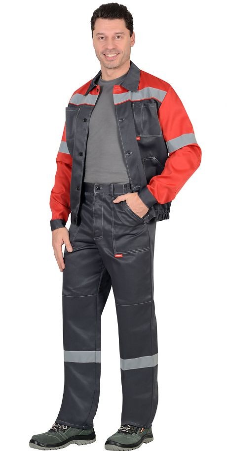 Куртка короткая, с налакотниками, с центральной застежкой на пуговицы, с верхними и нижними накладными карманами, с притачным поясом застегивающийся на пуговицу. Брюки с наколенниками, с застежкой гульфика на пуговицы, с притачным поясом, застегивающимся на пуговицу, с наколенниками. На костюме распологается СОП 50 мм.