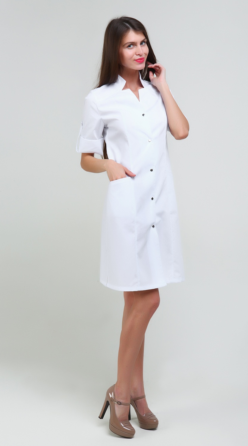 Халат медицинский женский прилегающего силуэта с центральной бортовой застежкой на 5 кнопок.
