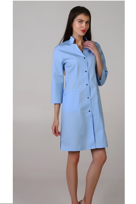 Халат медицинский женский прилегающего силуэта с центральной бортовой застежкой на 5 кнопок.