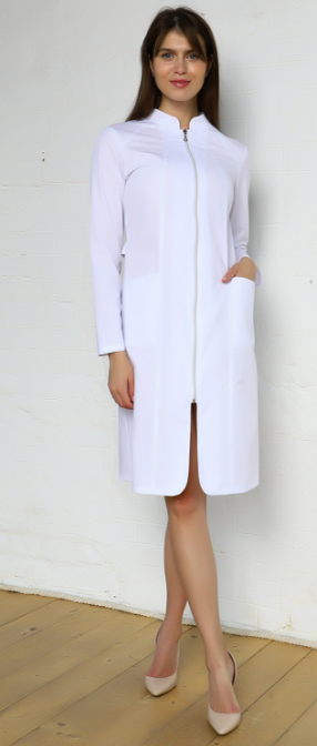 Халат медицинский женский прилегающего силуэта с центральной бортовой застежкой на тесьму-молнию.