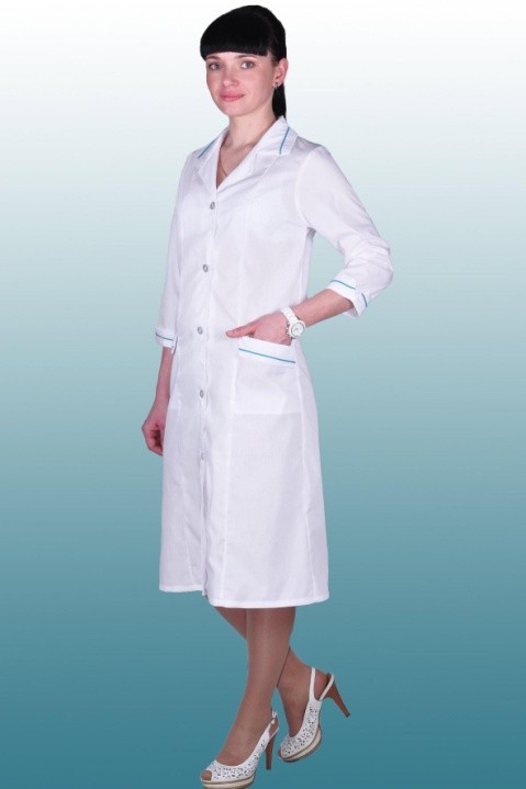 Халат полуприлегающего силуэта, рукав 3/4, на пуговицах. Отделочный кант по вороту, рукавам и карманам.