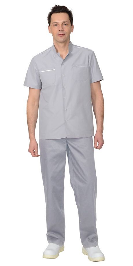 Блуза прямого силуэта, с центральной бортовой застежкой на кнопки, с воротником стойка, с верхними и нижними накладными карманами, с короткими, втачными рукавами. Кокетки и нагрудные карманы отделаны кантом контрастного цвета. Брюки прямые на притачном поясе, частично стянутым на эластичную тесьму, брюки с внутренними боковыми карманами.