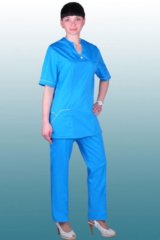 Костюм медицинский, короткий рукав, фигурный вырез горловины. С отделочным кантом по горловине, рукавам и карманам.