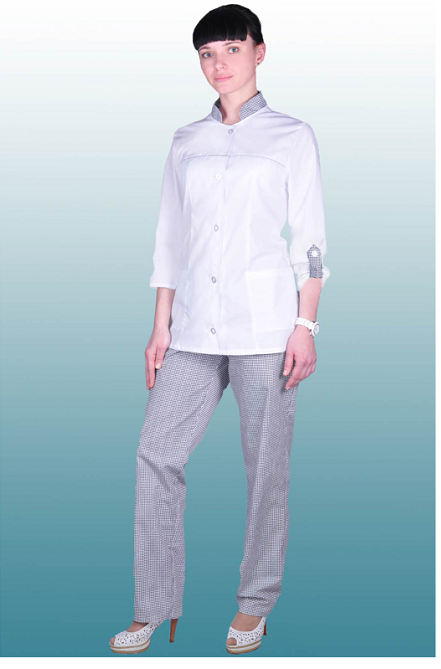 Костюм медицинский на пуговицах с рукавом 3/4, блузка с кокеткой, отделка по стойке и паты в цвет брюк.