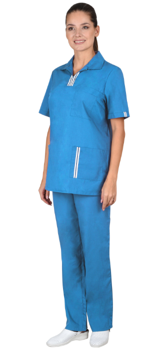 Костюм состоит из блузы и брюк. Блуза прямого силуэта с застежкой на тесьму "молния" в области кокетки. Отложной воротник. Нагрудный левый и два нижних накладных кармана. Рукава втачные, короткие. По низу блузы разрезы в боковых швах.