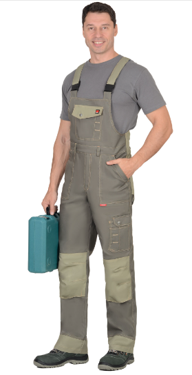 Полукомбинезон застежкой гульфика на тесьму - «молния», с застежкой в боковом шве на 3 джинсовые пуговицы, с фигурным карманом и клапаном на нагруднике застегивающийся на кнопку , с нижними накладными карманами с наклонным входом, с накладным фигурным карманом и клапаном застегивающийся на кнопку на боковом шве, с задними накладными карманами с отлетным нижним краем и фигурными клапанами застегивающиеся на кнопку , с объемными наколенниками на передних половинках с возможностью вставить в них амортизационные вкладыши. С фигурной спинкой, по спинке вставлена резинка для лучшего прилегания.
