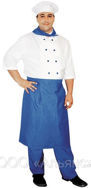 Комплект состоит из  куртки, брюк, фартука, колпака и шейного платка.