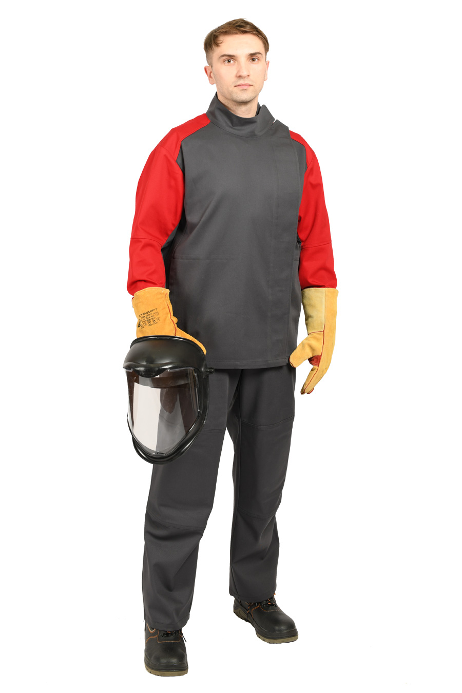 Куртка: прямого силуэта со смещенной влево потайной застежкой на пуговицы и петли и воротником-стойкой с фиксацией на контактную ленту. Напульсники из огнестойкой ткани, расположенные по низу рукава, обеспечивают дополнительную защиту от попадания искр. Анатомическая конструкция рукава. Боковые карманы в рельефных швах. Смещённые плечевые швы в сторону полочек обеспечивают свободу движения.