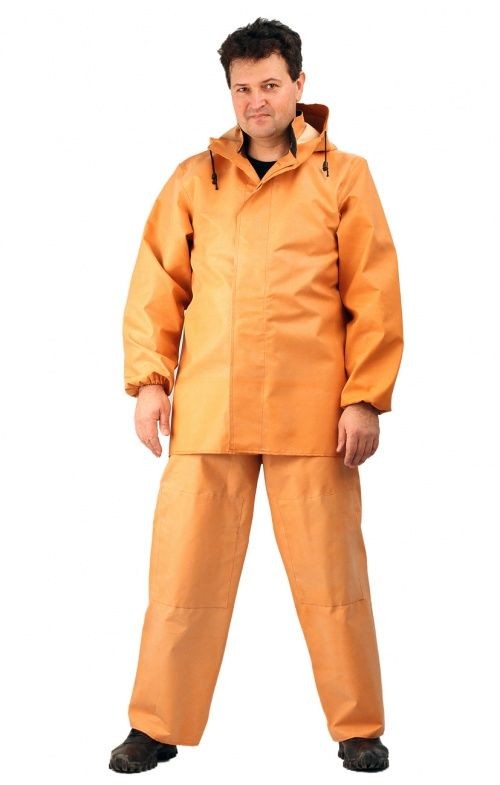 Рекомендуется для работников рыболовецких хозяйств и рыбоперерабатывающей промышленности. Костюм состоит из полукомбинезона и куртки с капюшоном. Куртка с центральной застежкой на пряжках из полуколец и ремешках из ткани костюма. Полукомбинезон с наколенниками. Изготовлен из специальной ткани стойкой к действию морской воды, рыбьего жира и т.д.