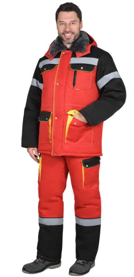 Полукомбинезон - прямой, с притачной утеплённой подкладкой, с регулируемыми по длине, при помощи пряжек – фастексов, бретелями; с притачным нагрудником; с центральной застёжкой на двухзамковую тесьму - «молния»; с нагрудными накладными карманами, с двумя боковыми внутренними карманами, с двумя накладными карманами на боковых швах, с фигурным клапаном, застёгивающимся на 2 кнопки на каждом клапане.