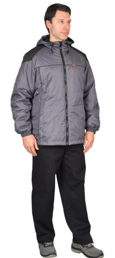 Куртка "Спринтер" мужская, темно-серая с черным Куртка, утеплённая прямого силуэта, с втачным капюшоном, центральной бортовой застёжкой на тесьму - "молния", с под планкой, с верхними прорезными карманами на "молнии" и нижними карманами в рельефах, с карманом на тесьму - "молния" на подкладке с левой стороны. Рукава втачные, с притачной манжетой частично стянутые на ткацкую резинку.