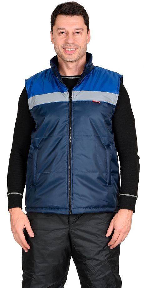 Жилет прямого силуэта, утеплённый, с притачной подкладкой, с центральной застёжкой на тесьму - "молния", с воротником стойка, с прорезными карманами с "листочкой" с втачными концами, с наклонным входом. Ткань верха: Оксфорд, состав - 100 % п/э, пл. 150 г/м2, один слой.Цвет: темно-синий