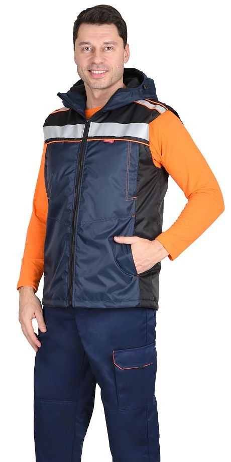 Жилет утепленный, с центральной бортовой застёжкой на тесьму-«молния», с подрезными бочками, с верхними карманами на «молнии» в рельефе, с нижними карманами в рельефе, с втачным капюшоном. В жилете предусмотрена лента светоотражающая (мелкодисперсная белая) 25мм и 50мм