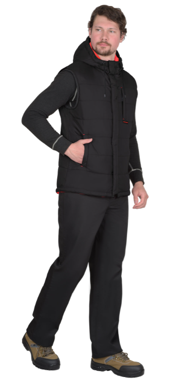 Жилет утеплённый, выстеган с утеплителем горизонтальными строчками, с подкладкой контрастного цвета, с втачным капюшоном, с застёжкой на молнию, закрытую ветрозащитным клапаном от края капюшона до низа изделия, застёгивающимся на кнопки. Жилет с одним нагрудным карманом с молнией и двумя нижними карманами. Спинка жилета, удлинённая с фигурной линией низа. Пройма окантована резинкой. Объём капюшона по лицевому вырезу регулируется шнуром с фиксаторами.